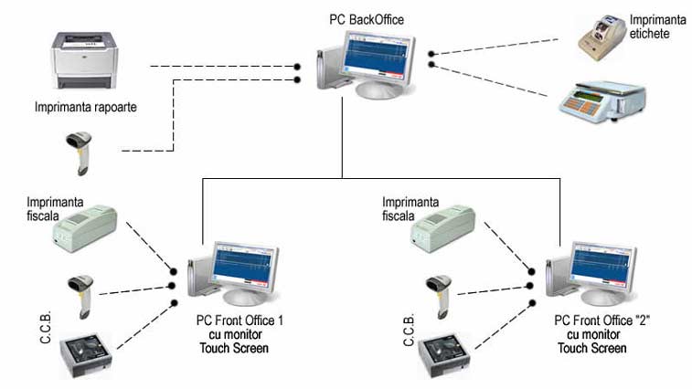 Partea de backoffice cuprinde: 1).Scaner pentru coduri de bare necesar la receptia marfii 2).Imprimanta pentru etichete coduri de bare 3).Imprimanta pentru listare documente. 4).Unul sau mai multe cantare cu etichete coduri.
